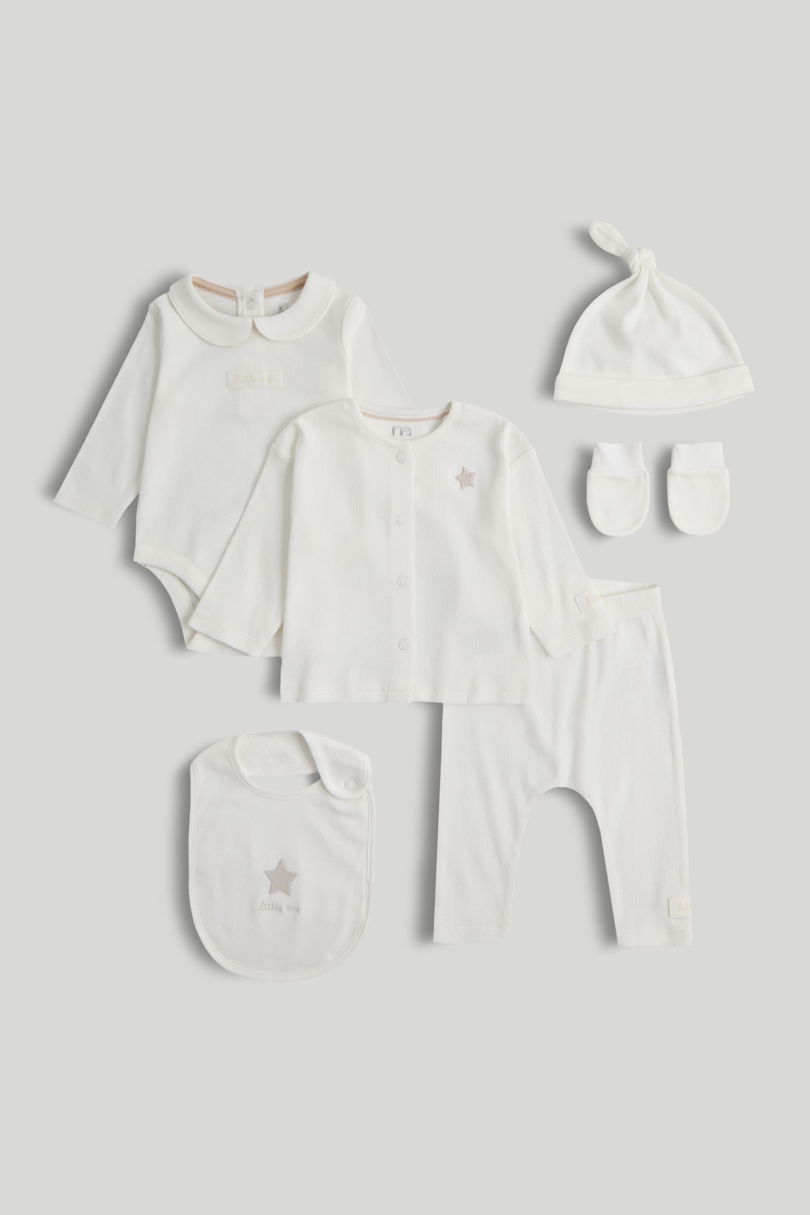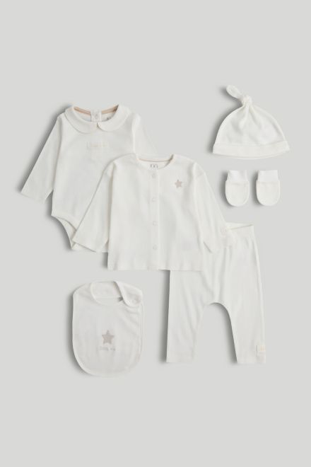 Mothercare Комплект боди, брюки, кардиган, шапка, фартук нагрудный и варежки-царапки LAX30601 унисекс