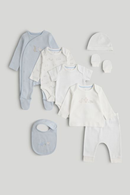 Mothercare Комплект слип, боди 2 шт., брюки, лонгслив, фартук нагрудный, варежки-царапки и шапка LAX35301 для мальчика