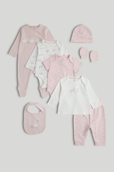 Mothercare Комплект слип, боди 2 шт., брюки, лонгслив, фартук нагрудный, варежки-царапки и шапка LAX39001 для девочки